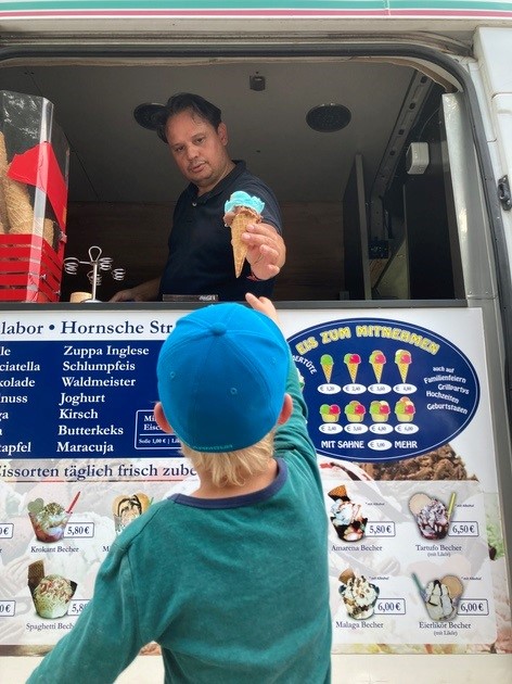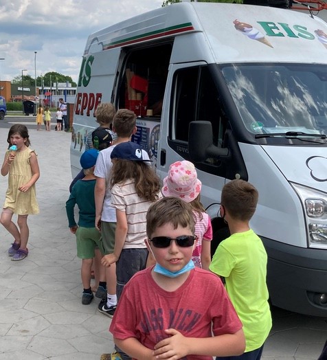 Bei der Hitze wurde spontan der Eiswagen bestellt und der Förderverein hat für alle Kinder Eis ausgegeben.